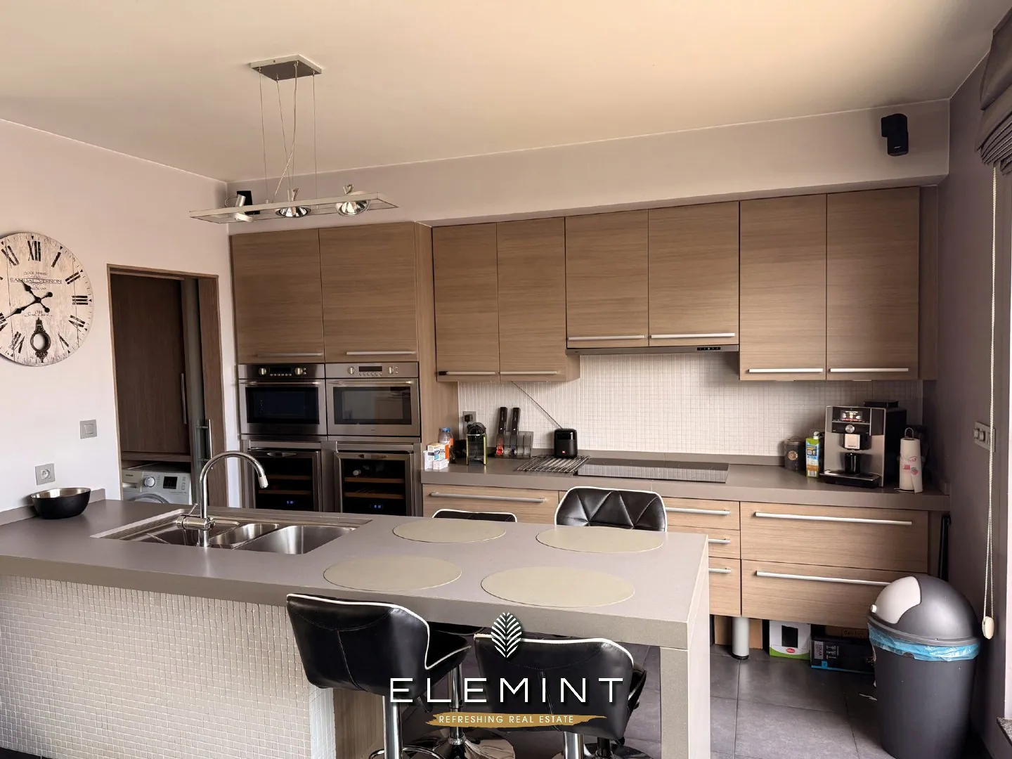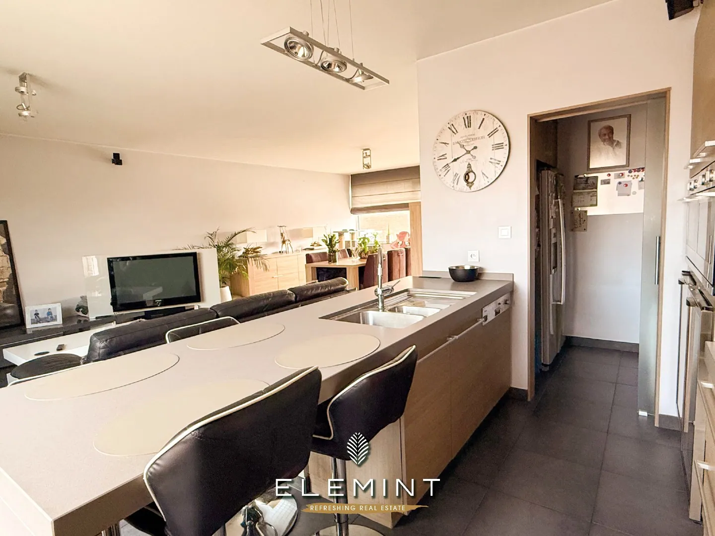 De verdere indeling over meerdere niveaus zorgt voor een aangename scheiding tussen leef- en slaapgedeeltes. Op het eerste niveau bevindt zich de lichtrijke leefruimte met directe toegang tot het ruime terras met vijver — een unieke troef waar het heerlijk vertoeven is.